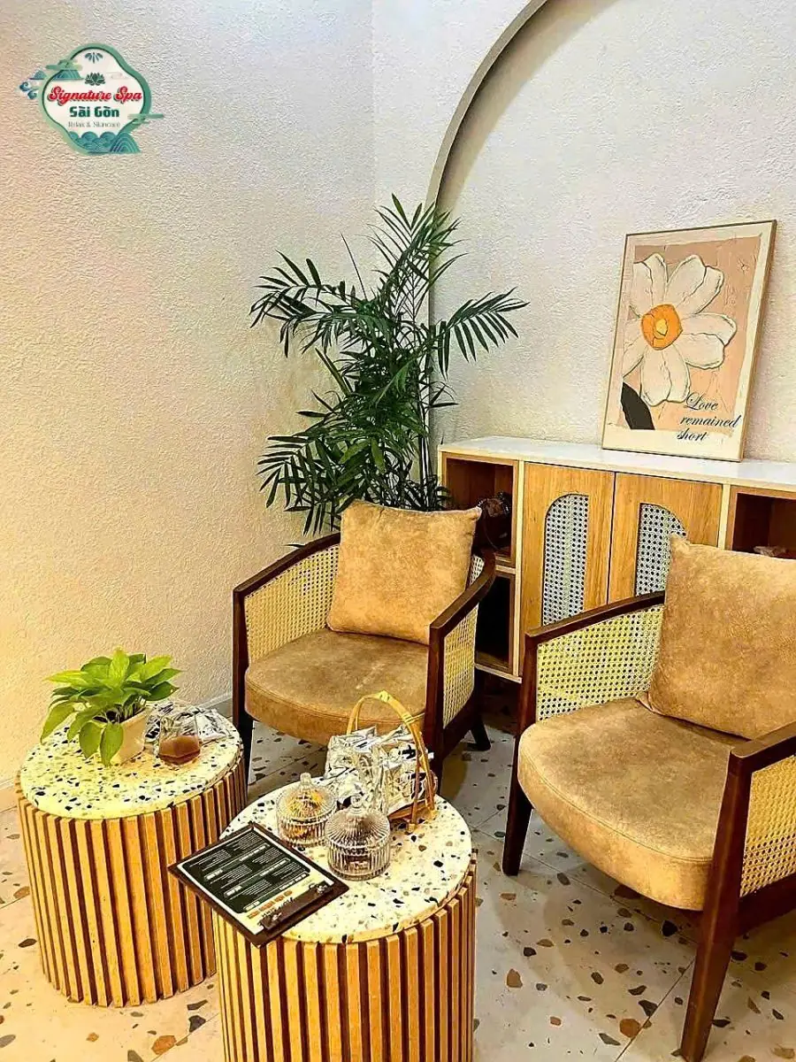 Phòng chờ tại Signature Spa được thiết kế như một góc nhỏ ấm áp, với ánh sáng vàng nhạt, ghế bọc nệm êm ái và những chi tiết trang trí mang hơi hướng thiên nhiên. Khách hàng sẽ được thưởng thức các loại trà thảo mộc như hoa cúc, bạc hà hoặc gừng, giúp làm dịu cơ thể và tâm trí. Hương thơm từ tinh dầu oải hương và gỗ đàn hương lan tỏa trong không gian, tạo nên một bầu không khí thư giãn sâu lắng, sẵn sàng đưa bạn vào trạng thái cân bằng.